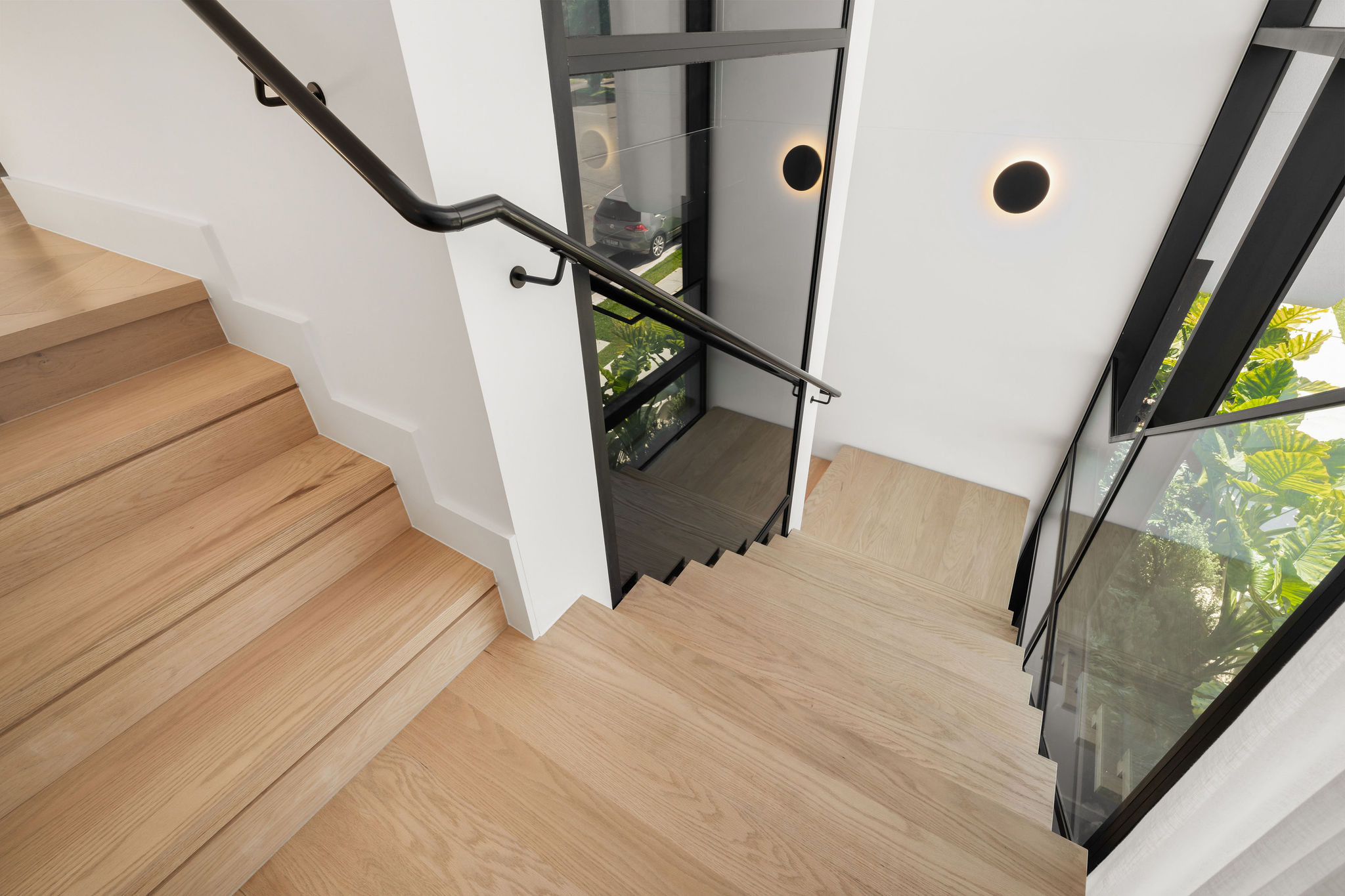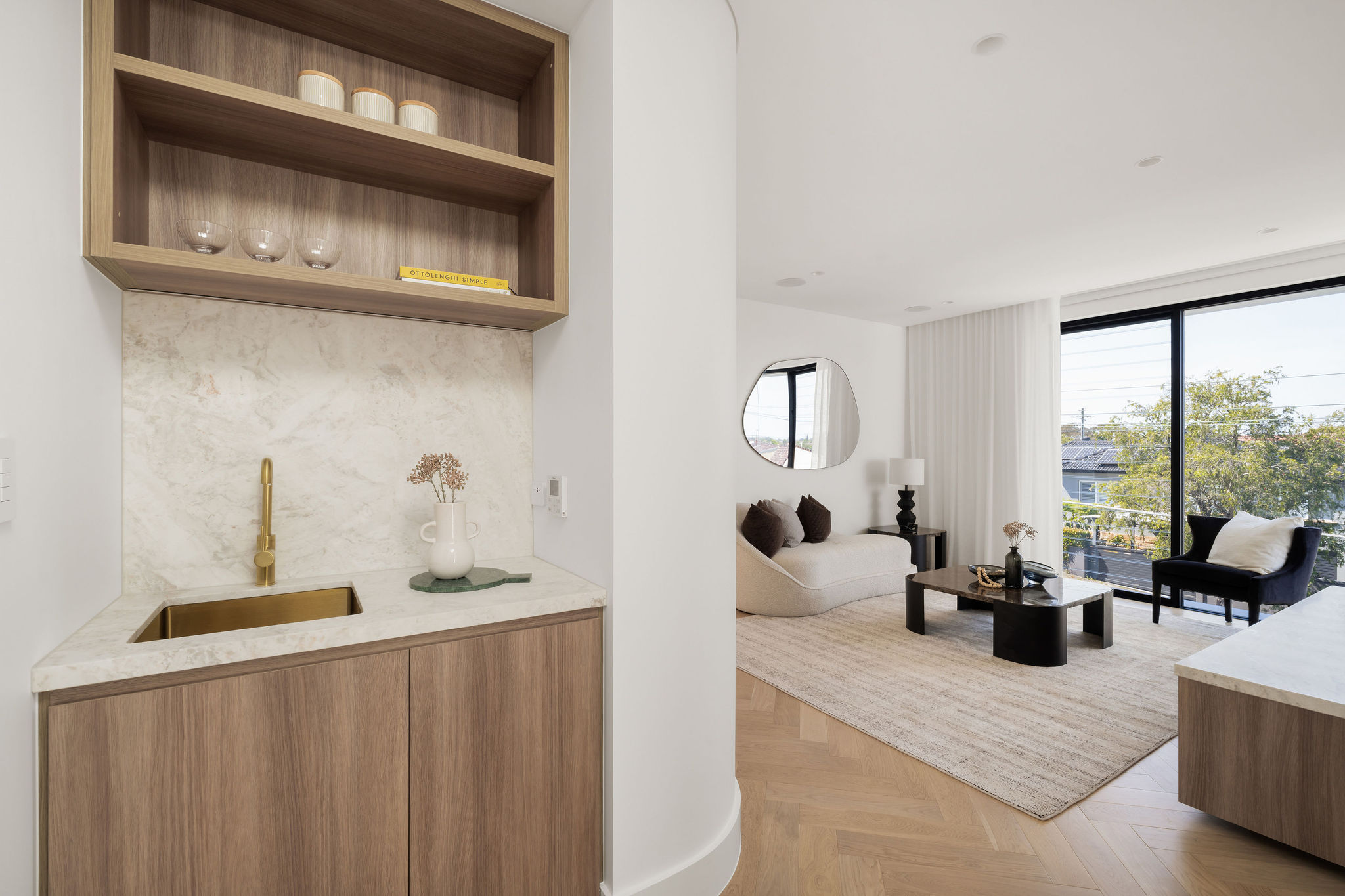 A sculptural staircase winds gracefully through the home, complemented by a glass-framed lift that connects the garage to every floor, making daily life effortlessly convenient. The home’s striking geometry is softened by layers of natural material with Calacatta marble, French oak and aged brass chosen for their warmth, texture and timeless appeal.